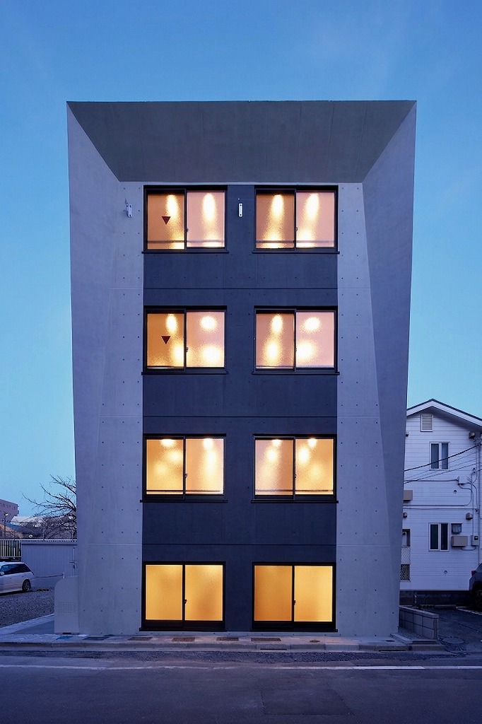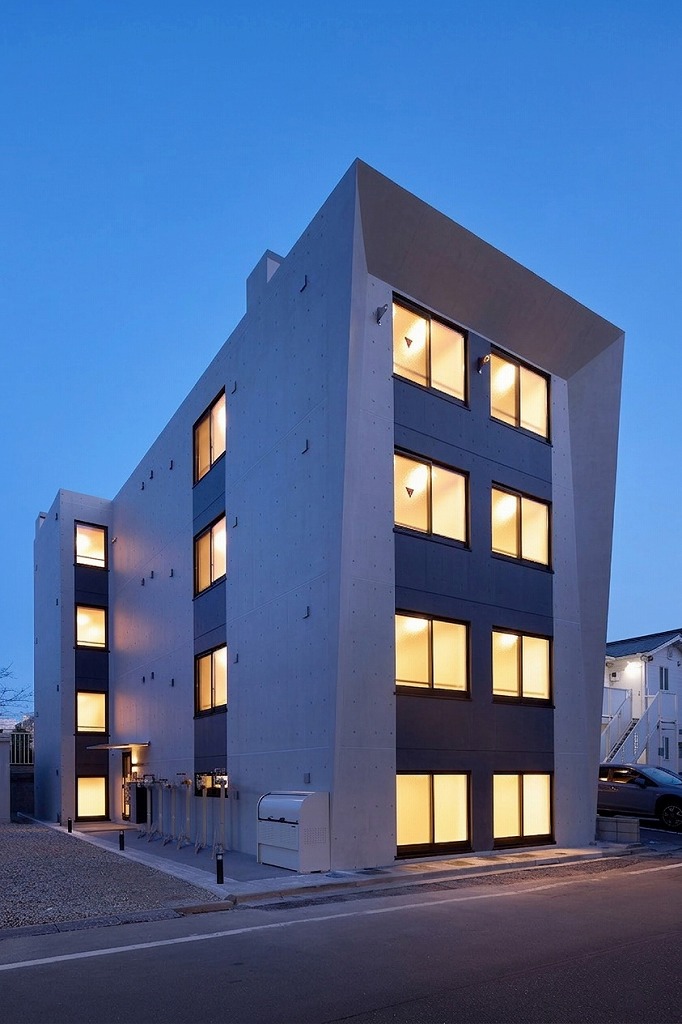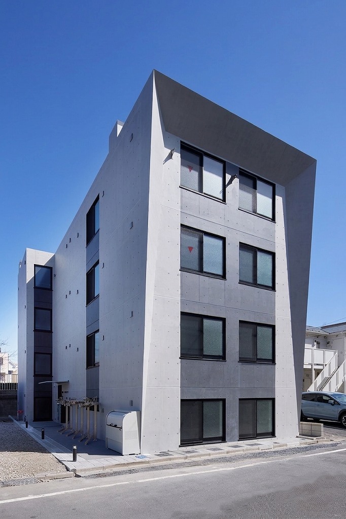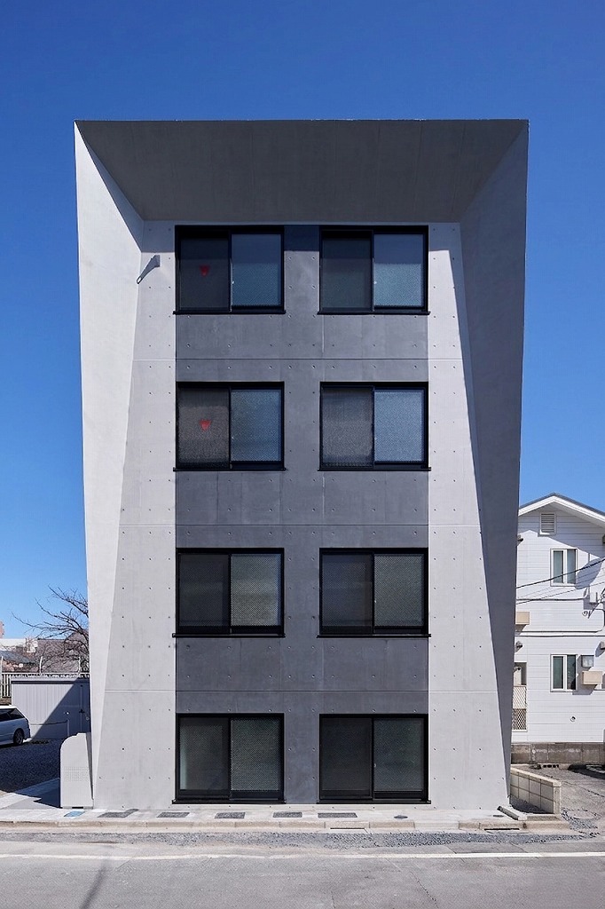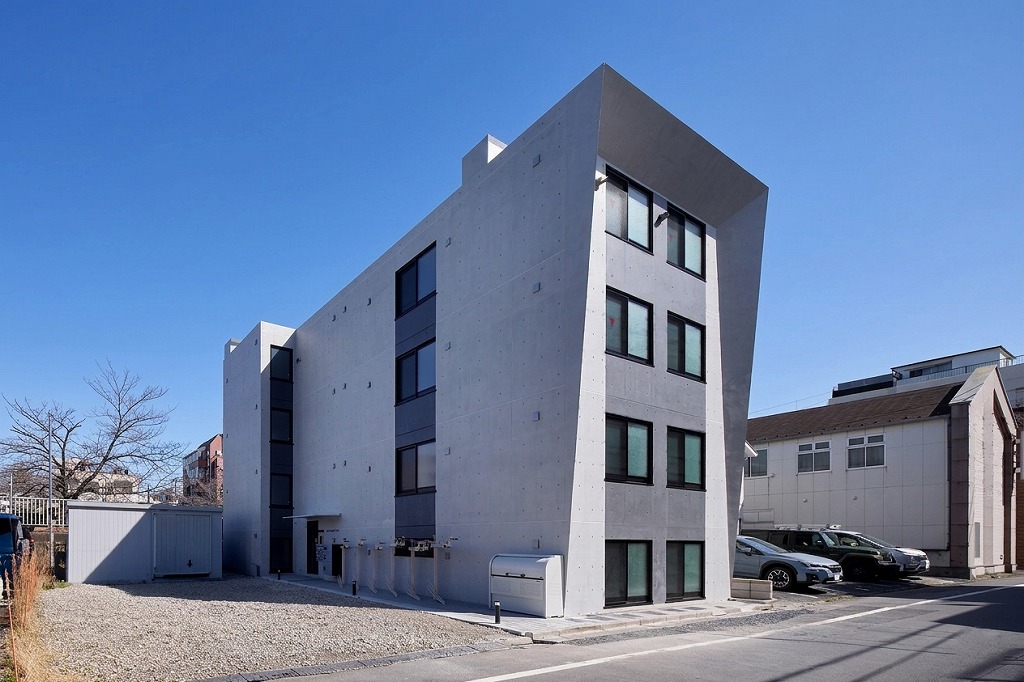 外観の大きな特徴は、上部に向かって翼を広げるように斜めにせり出した外壁のラインです。